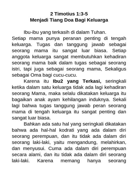 Isi 2 Timotius 1:3-10 Aku mengucap syukur kepada Allah, yang kulayani dengan hati nurani yang murni seperti yang dilakukan nenek moyangku. Dan selalu aku mengingat engkau dalam permohonanku, baik siang maupun malam. Dan apabila aku terkenang akan air matamu yang kaucurahkan, aku ingin melihat engkau kembali supaya penuhlah kesukaanku. Sebab aku teringat akan imanmu yang tulus ikhlas, yaitu iman yang pertama-tama hidup di dalam nenekmu Lois dan di dalam ibumu Eunike dan yang aku yakin hidup juga di dalam dirimu.